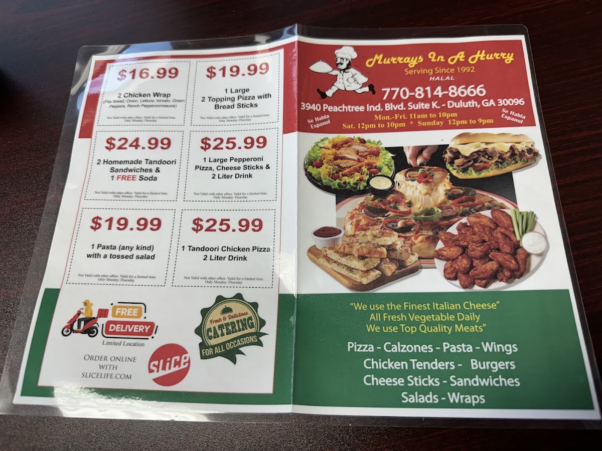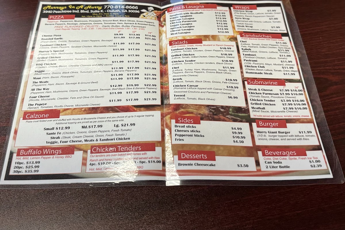 Introducing Murrays In A Hurry, a gem located at 3940 Peachtree Industrial Blvd, Duluth, GA. This eatery prides itself on offering a diverse and mouth-watering menu that caters to various tastes. From delectable sandwiches like the Chef, Pastrami, and Tandoori, all at just $7.99, to flavorful wraps such as the Chicken and Gyro for $5.99, there's something for everyone. Their calzones, available in sizes from small to large, are a hearty option that won’t disappoint.